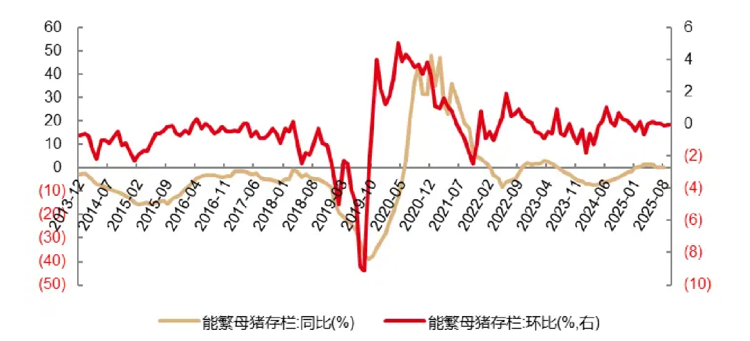值得关注的是,在行业亏损扩大、政策驱动产能调减背景下,9月产能出现一定程度下滑。根据农业农村部,9月能繁母猪存栏4035万头,同比减少28万头,下降0.7%,环比减少9万头,略降0.2%。