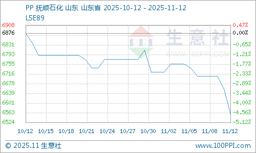 据生意社商品行情分析系统,11月前半月国内PP市场行情震荡运行,各牌号产品价格跌多涨少。截止11月12日,生意社PP拉丝基准价6556.67元/吨,较11月初价格水平下跌2.48%。