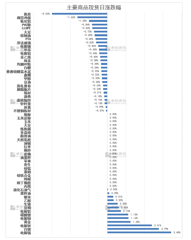 12月12日,卓创资讯监测商品现货市场13种上涨、28种下跌,21种企稳。能源化工板块偏弱震荡,PVC、LLDPE等品种跌幅居前;贵金属板块强势领涨,白银以2.79%涨幅居前,黄金同步涨1.25%,板块热度突出;有色金属板块多数走强,电解锡、电解锌分别涨3.45%、2.41%;农产品板块走势分化,豆粕、生猪分别上涨0.62%、0.55%,褐壳鸡蛋跌1.62%领跌板块;黑色系板块多数保持企稳,少数品种小幅下跌。(价格涨跌幅均以卓创资讯监测现货商品均价或主流市场价格计算)