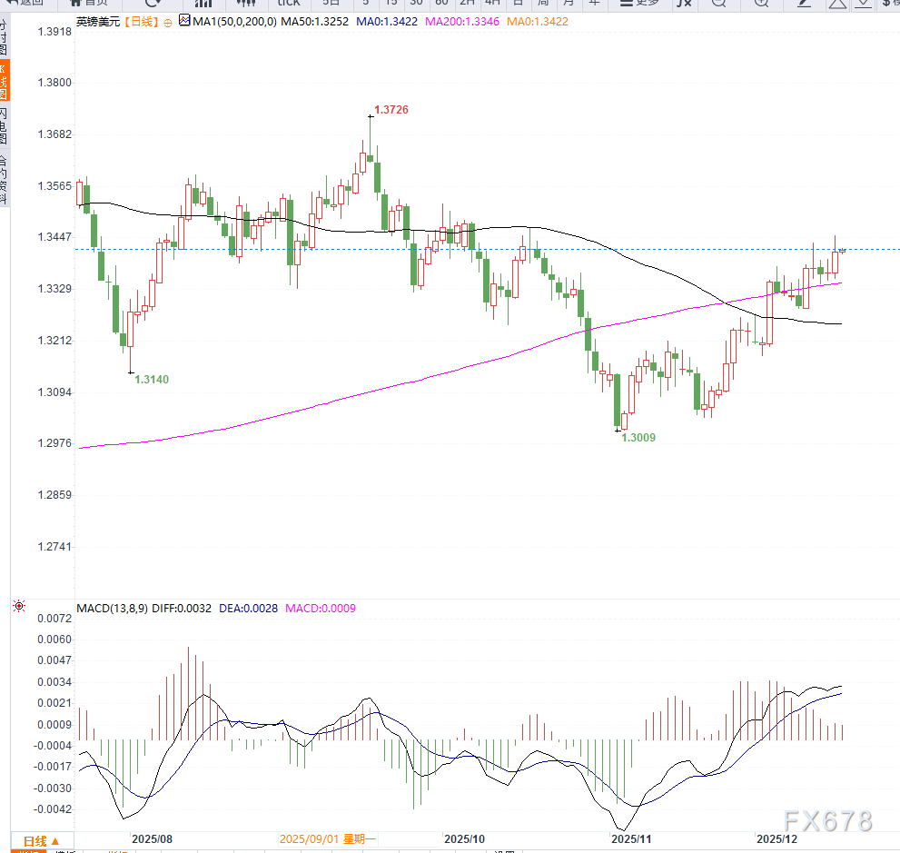 从技术结构看,英镑兑美元短线呈现温和反弹特征:短期支撑位1.3360–1.3380区间,若跌破,可能重新测试1.3300;上方阻力位1.3450附近,进一步阻力位于1.3500整数关口;