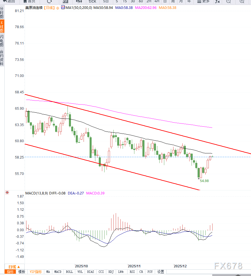 在技术面上,美原油日线走势仍处于弱势修复阶段。从形态看,价格在此前快速下跌后于57.8–58.0美元区域形成阶段性支撑,近期连续收出小阳线,显示低位买盘开始介入,但反弹力度仍偏温和。