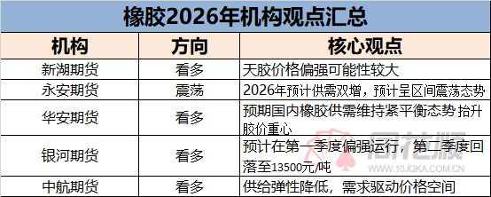 展望2026年,预期国内橡胶供需维持紧平衡态势,抬升胶价重心。供应方面,预期2026年供应增速放缓。橡胶主产国面临胶树老龄化和低经济效益难题,产胶动能不足,产能趋势收缩,而新兴产区扩种增产,但是树龄低割胶率也低,低产能释放难以弥补。成本方面,面临三方博弈,预估零关税进口政策降低约2成供应胶成本,过剩油支撑丁二烯成本力度变弱,EUDR法案贯彻执行将助涨长期生产成本。需求方面,轮胎配套市场分化内需承压,替换市场依赖汽车市场高保有量和政策利好表现坚韧,重点关注扩内需政策效果。2025年消费补贴政策刺激内需效果较好,2026年宽松政策延续补贴力度扩大,让市场形成良好消费预期。然而,让人形成良好预期的是宏观经济政策,但易变性强的也是宏观经济政策,内外需能否得以强提振难以确定,唯一能确定的是上游主产区的产能收缩和EUDR法案助涨成本,仅从此看,均会对胶价提供底部支撑推涨作用,涨幅受限于过剩低价合成胶。