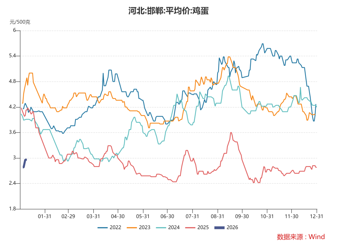 2025年四季度,鸡蛋现货价格持续低位震荡。不过自元旦开始,鸡蛋现货价格出现小幅走强迹象。以河北敦朴贸易为例,45斤鸡蛋报价从1月1日的121元上涨至1月8日131元。我们分析认为,1月份开始鸡蛋现货价格将逐步具备走强动能。